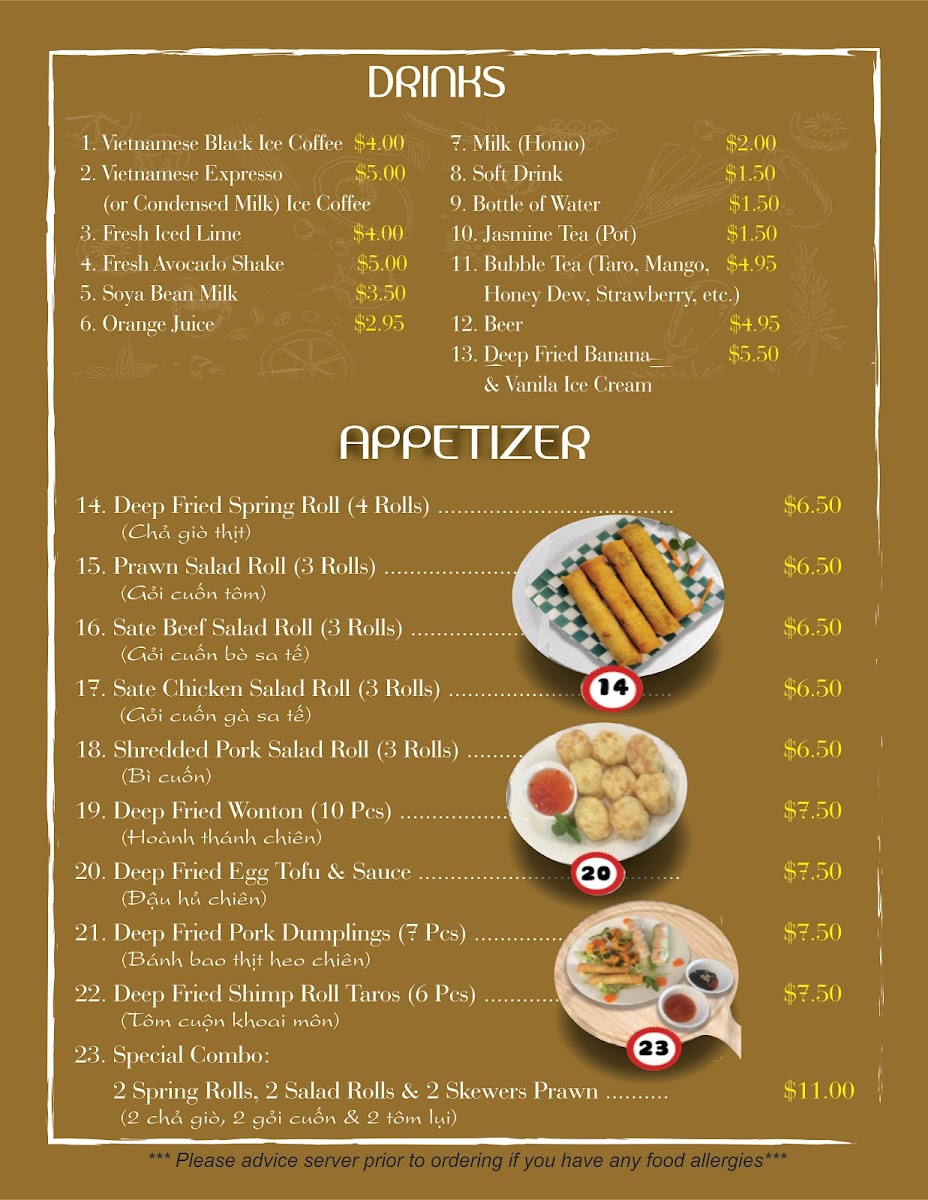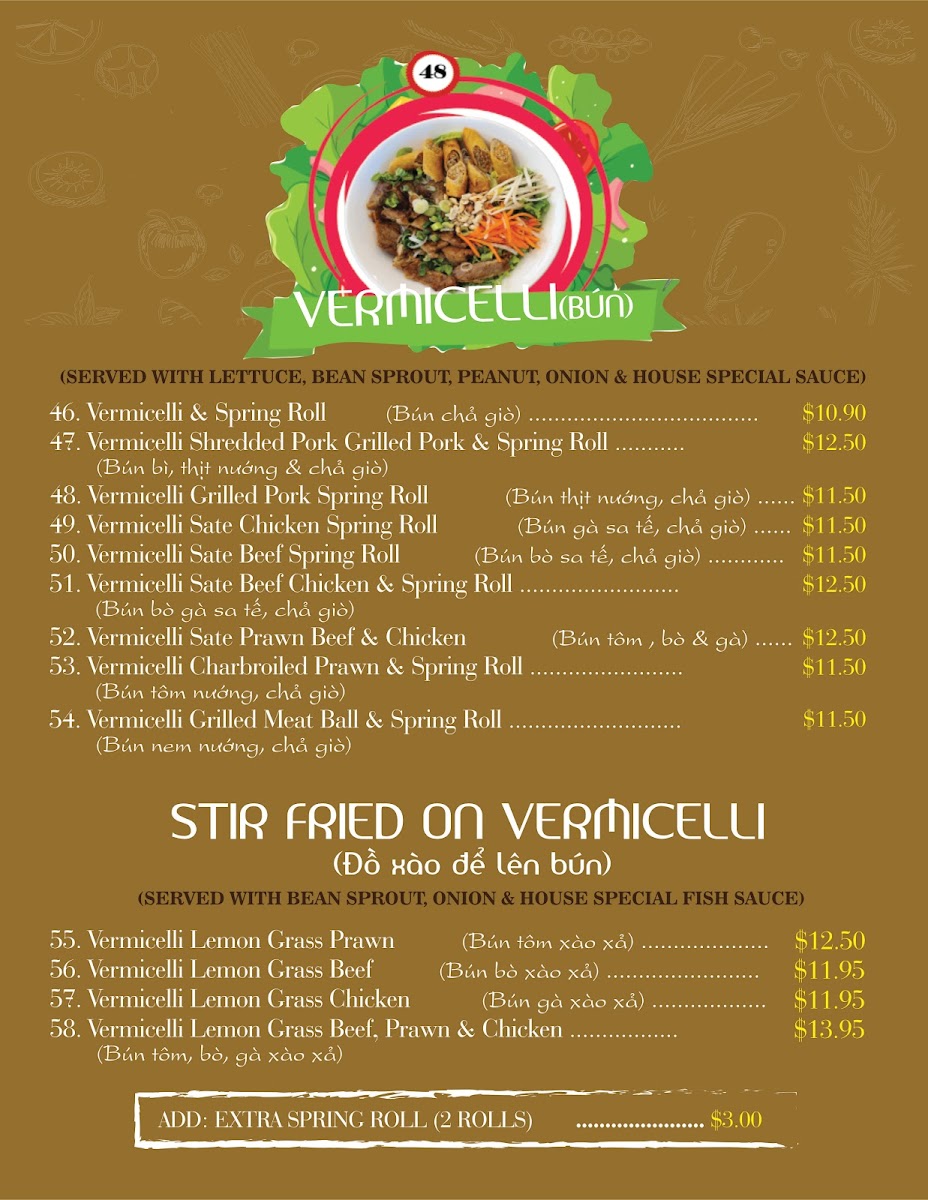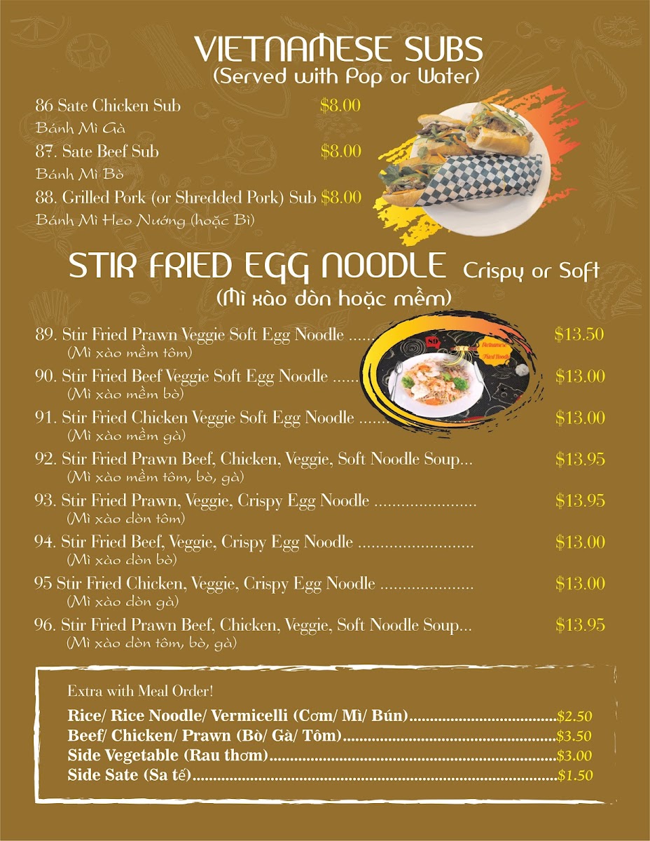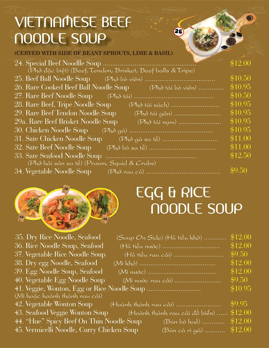 The Egg & Rice Noodle Soups, such as Dry Egg Noodle, Seafood (38) or Vermicelli Noodle Curry Chicken Soup (40), provide a warm, aromatic start, while the Beef Noodle Soup section-featuring classics like Sate Beef Noodle Soup (32) and Rare Beef Tendon Noodle Soup (29)-delivers the rich, deep flavors that define Vietnamese pho.