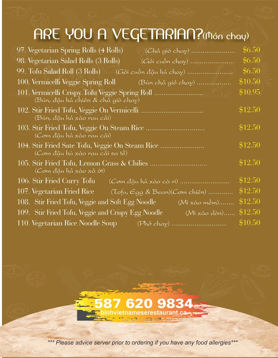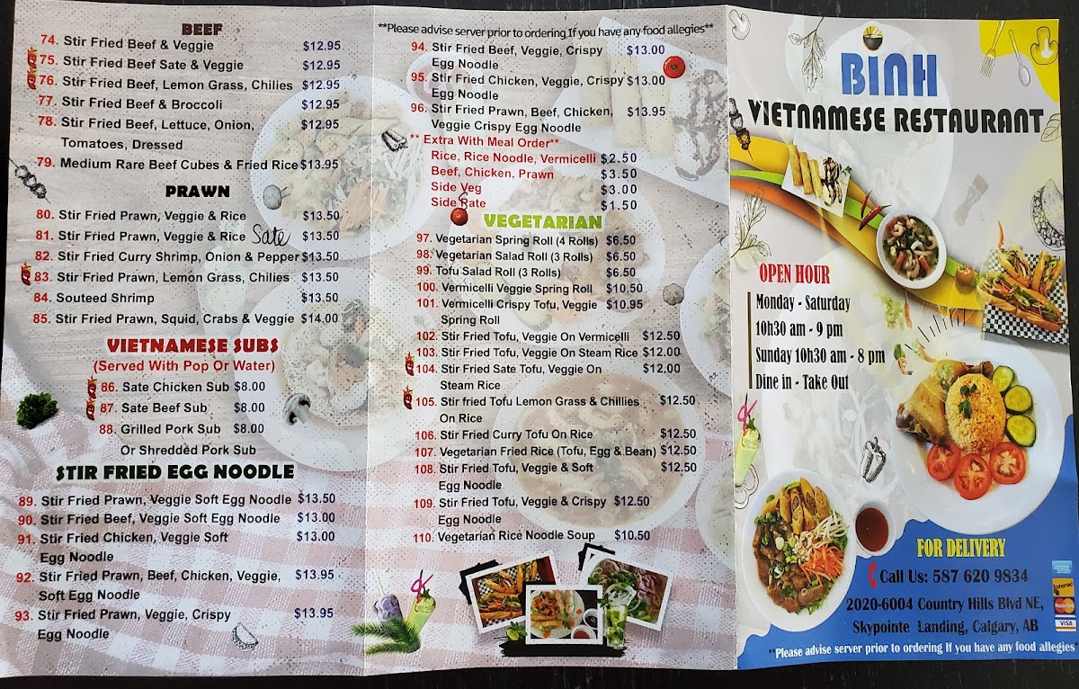 Binh Vietnamese Restaurant, located at 6004 Country Hills Blvd NE #2020, Calgary, offers a truly authentic Vietnamese dining experience, reflected through its extensive and diverse menu. From the very first glance, it’s evident that the restaurant caters to every craving-whether you’re in the mood for comforting soups, savory stir-fries, or refreshing vermicelli bowls.