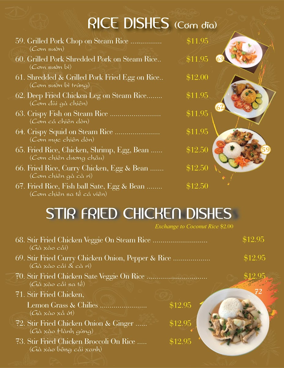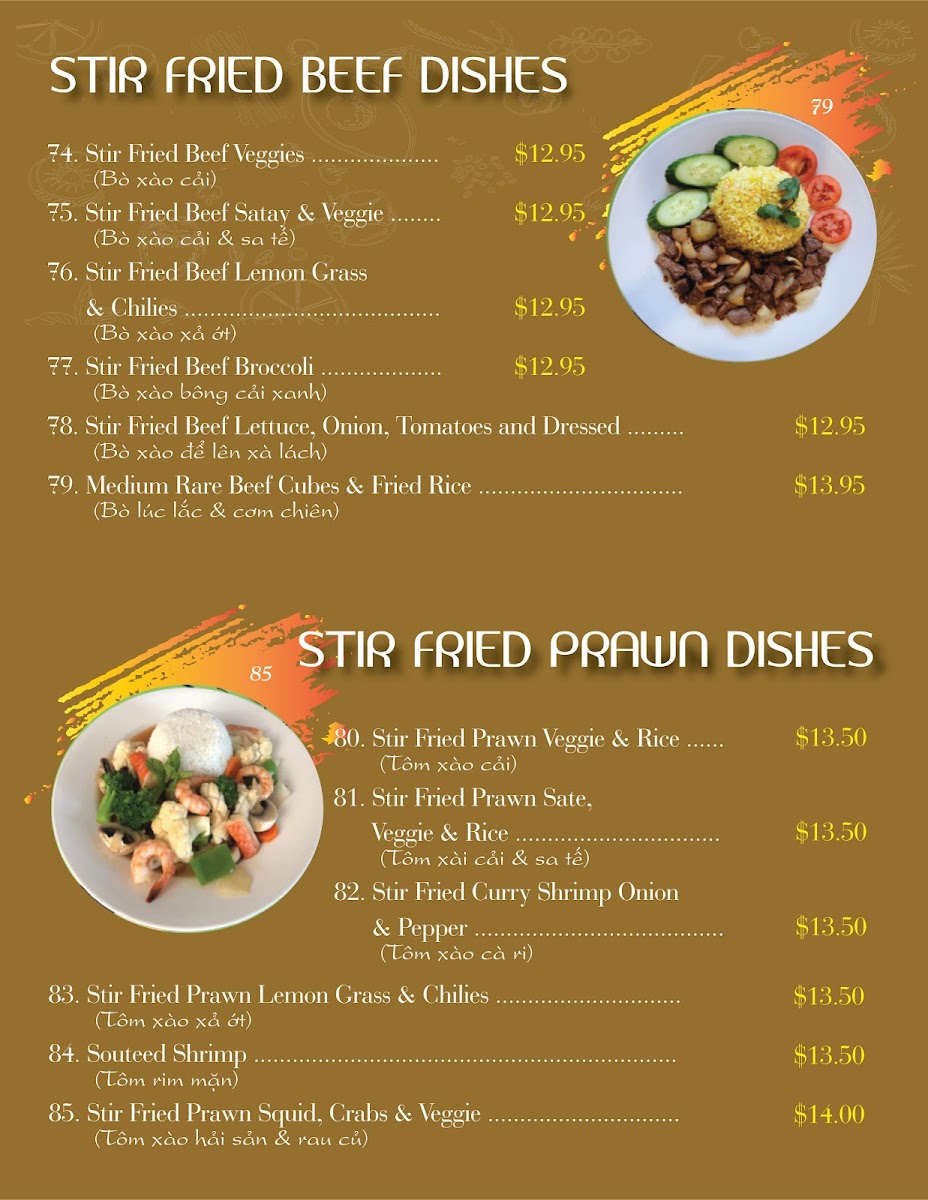For those who prefer something hearty, the Rice Dishes like Grilled Pork Chop On Steam Rice (59) and Crispy Fish On Steam Rice (63) are satisfying and beautifully balanced. The Stir-Fried Chicken Dishes, from Gà Xào Xả Ớt (71) to Gà Xào Cải & Cà Ri (69), showcase tender meats coated in flavorful sauces, while the Stir-Fried Beef (74-79) and Stir-Fried Prawn (81-85) dishes highlight freshness and perfect wok technique.